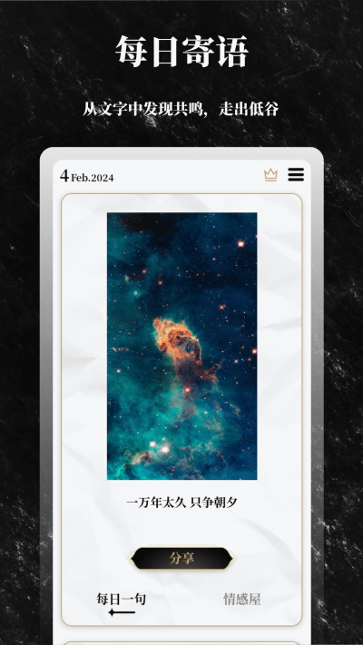 4、情感名言:每天一句充满希望的话语。 希望你能从文字中感受到力量,找到共鸣。 还有通过图片、文字和音乐分享的情感名言。 这本答案之书将是你低谷时的向导,也是打开你心结的钥匙。