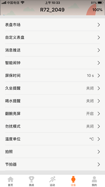 当您佩戴设备并与APP同步时,您可以在APP中选择开启天气提醒、消息推送、闹钟提醒、久坐提醒、喝水提醒到设备,以达到有规律的生活。
