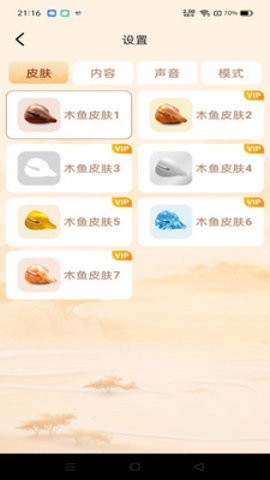 1、该应用包含多种木鱼敲击声和音乐音效,允许用户根据个人喜好选择敲击方式。