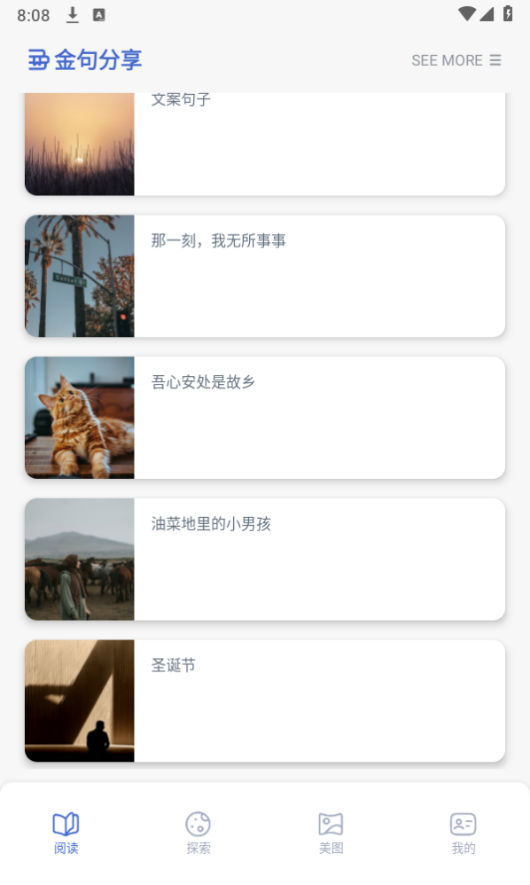 小小追书阅读器App是一款提供优质文案推荐,实时浏览的阅读软件,涵盖了文案、美文等多种内容,充分满足用户的阅读需求;该平台推送更多风格的文案佳句,全部免费展示在我们眼前哦,而且文案素材包含了不同的主题和类别,充分满足大家的阅读需求。小小追书阅读器App通过不断的知识积累,让我们的文化素养得到提升,同时该平台还提供文案复制与分享功能,日常发布动态再也不愁缺乏合适的内容了。