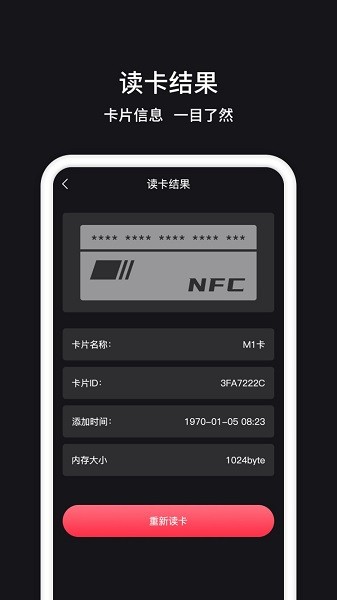 读取nfc卡片信息,并且可以直观查看读卡结果,信息一目了然。