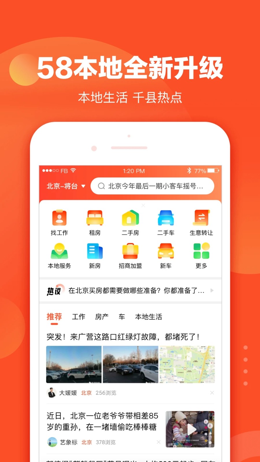 58本地版app是一款为用户带来了招聘,求职,找房,买车等多种服务功能的手机软件,让大家的生活更加的简单便捷。还为用户带来了本地的热点资讯,让你可以时刻关注发生在自己身边的重要事情,而且为用户带来了交流板块你在这里和附近的人进行交流学习。