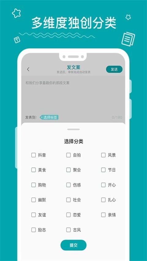 爱情、悲伤、励志、青春、社会语录?? 主流品类包括数千篇文案。