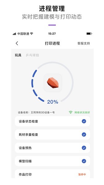 设备连网后,打印进度实时掌控,支持远程操作与多台设备连接。