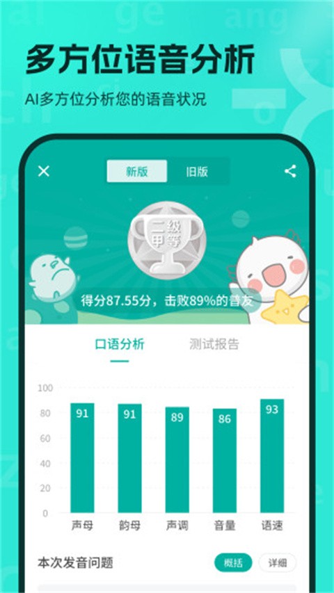 该软件采用先进的人工智能评估技术,对你的普通话发音进行评分,帮助你发现发音错误。 有针对性的纠正,有效提高普通话水平。
