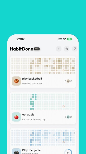 HabitDone软件可在这里改善自己的喜欢,想怎么设置目标都可以的,每天完成目标都可以进行打卡的,还可以开启重要的提醒,避免自己忘记完成任务以及打卡了,这里也可以进行图表数据分析,想怎么进行使用都是支持的。
