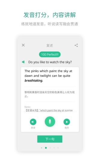 3、课前预习——跟读模仿——听复述——智能评分——精彩分析,完整教学逻辑。 一句一句地听,练,骂起来就有效果了。