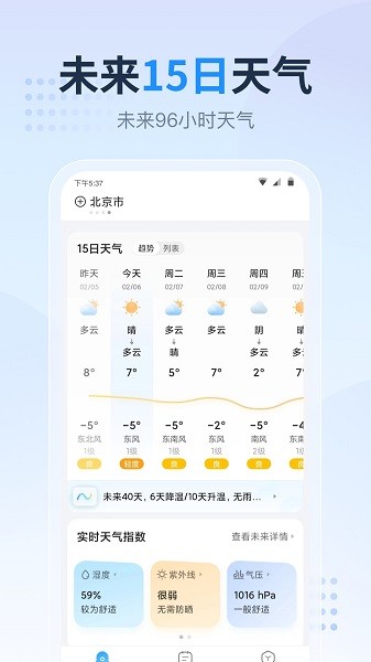 实时空气质量监测:认真呵护您的健康,实时更新空气质量、PM2.5等指数预报提供未来48小时及15天空气质量预报。