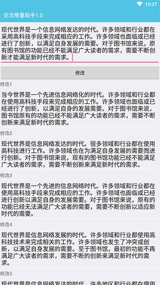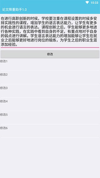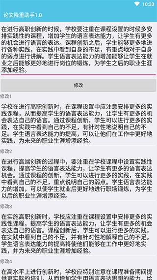 论文降重助手是一种帮助学者降低论文重复率的工具,通常通过优化句子结构、改变句型和替换同义词等方式来实现。该软件的界面简洁、清爽,它没有太多复杂的功能,只有减少重复的功能,但这个功能是每个人都需要的,它不需要你漫无目的地反复修改论文,检查重复项时只需检查重复项即可,将重复率高的句子复制粘贴到修改框中,然后点击修改,它会自动为你生成新的句子,并提供多种修改方法,你只需选择自己满意的句子,抄在纸上即可,这样可以有效降低重复率,让你的论文轻松通过,有需要的用户直接下载就可以开始体验了。