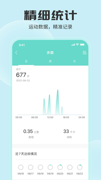 通过手环计步上传给APP保存,并可设置运动目标,查看每天达标情况。