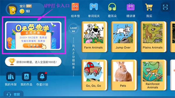 4、【成就系统】通过听绘本、采单词、读绘本、分享绘本,即可免费赚取积分,参与赚星计划。