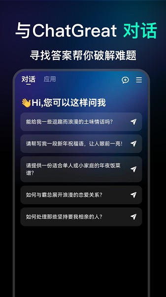 ChatGreat官方手机版app让大家在手机上体验全新的大模型,生成图文内容都是非常方便的,想怎么和智能机器人聊天都行的。线上可以咨询智能机器人任何的问题,能够成为自己的百科全书,每次咨询问题都是及时回复的。