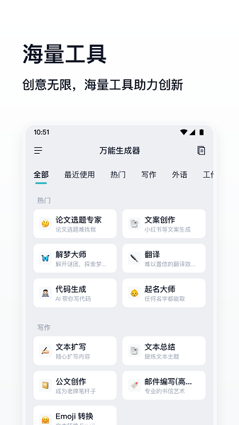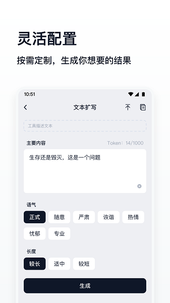 无论是需要扩充内容的文本、精炼的总结还是正式的邮件编写,万能生成器都能提供专业的写作支持,让您的文字更加生动、准确。