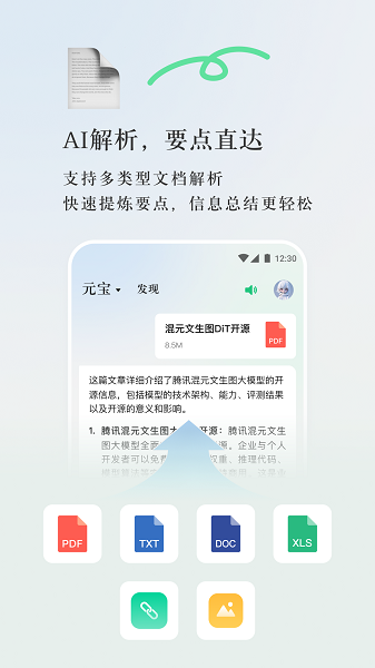 元宝支持多类型的文件、图片识别及阅读,用户可直接上传文件,快速输出要点,信息总结更轻松。