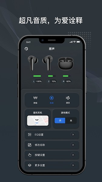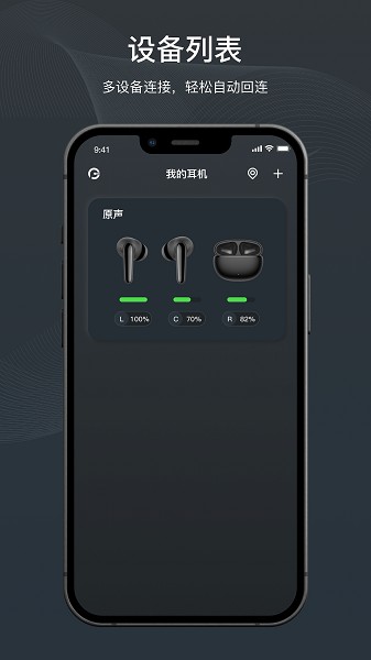 原声耳机app可以让大家在这里自由的连接蓝牙耳机,想怎么添加多个蓝牙耳机都行的,能够快速进行设置。平台上可以显示蓝牙耳机的电量,还可以调整音效了,自定义按键也是支持的,让大家平时使用蓝牙耳机都非常便捷。