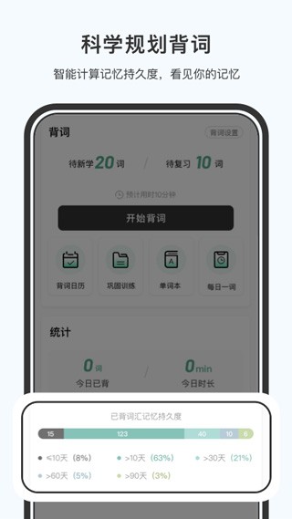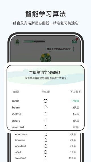 2、【小记背单词】根据艾宾浩斯遗忘曲线和人脑全记忆周期理论,科学分析每个单词在你记忆中的持久度。 对于记忆力较弱的单词,我们会智能安排重点复习,提高单词记忆效率。 通过不断的记忆巩固,单词的记忆持久度会逐渐增强。