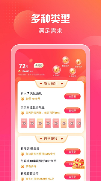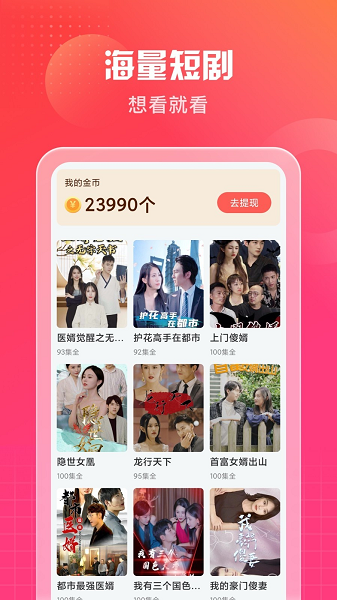 南瓜短剧红包版软件为大家整合了全网优质的短剧资源,每天都在持续进行更新中,想怎么分类筛选自己想看的短剧都行的。平台上可以让大家查看各种精选的短剧,连载中或者完结的短剧都可以轻松进行点播,及时观看。