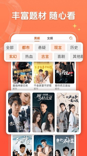 短剧题材丰富,都市、悬疑、热血、甜宠、校园、职场、爱情、言情、动作、年代剧、历史、喜剧、古装、宫斗、玄幻、爽剧、重生、穿越......你想追的短剧这里都有!满足用户的不同喜好。