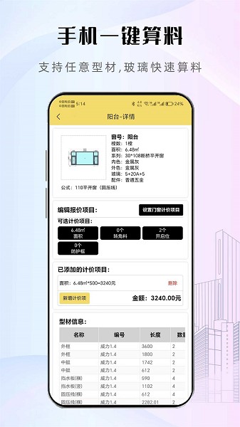 支持手机门窗算料,只需填写简单的门窗公式,易绘都能帮您计算生产所需的型材和玻璃