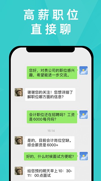 在线跟招聘人员进行线上沟通交流,让你可以更好的了解职位的基本工作信息。