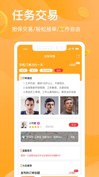 任务在线担保交易,在线沟通轻松接单,让工作变得自由。
