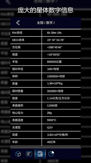 提供天体的主要数据,如赤经、赤纬、距离、目视星等,以及高清的计算机模拟图。