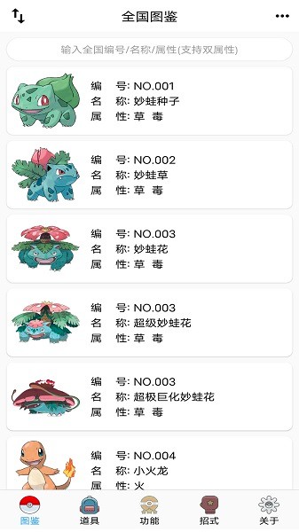 1、全国图鉴:包含宝可梦的基本信息,但是进化链和招式还在优化中。