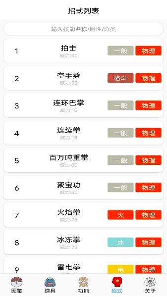 2、招式列表:包含了全部的宝可梦技能。