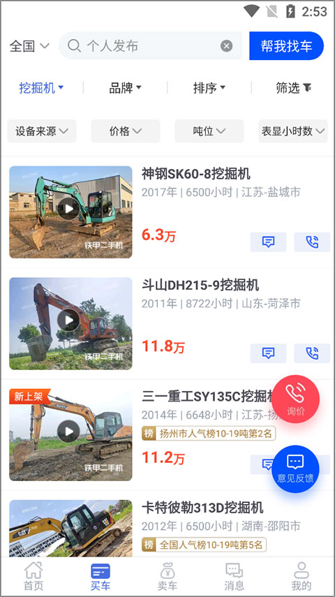 1、在首页点击买车,进入买车页面,点击左上角可以选择省份。用户根据需要选择机型、品牌、型号,还可以根据设备来源、价格、吨位、表显小时数等条件进行筛选。