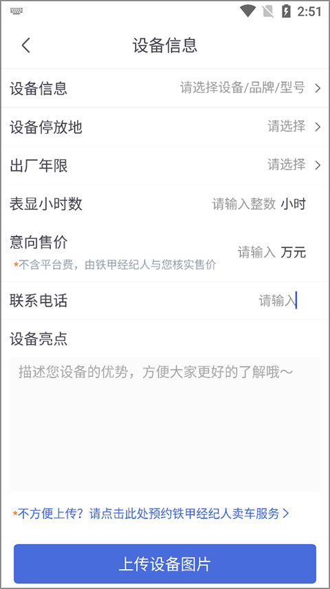 3、填写设备信息、设备停放地、出厂年限、表显小时数、意向售价、联系电话、设备亮点等信息,点击上传设备图片。