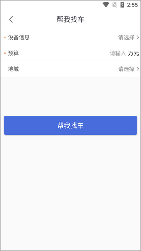2、没有找到合适机械的用户,还可以点击帮我找车,填写设备信息、预算、地域,点击帮我找车就可以根据你的求购信息自动匹配。