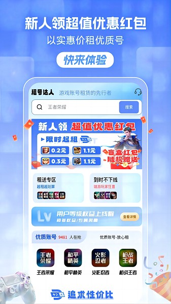 租号达人app为大家带来了非常全面的游戏租号平台,在这里租各种手游的账号很方便的,为各种游戏进行了划分,想怎么租大神账号都行的,租用多长的时间都可以自由选择套餐,让大家租号更加的实惠了,而且还有红包可以领取。