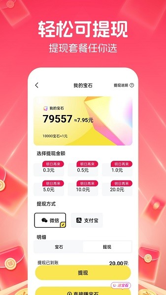每日签到、幸运转盘、领现金开红包、赚宝石等多种福利活动。
