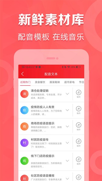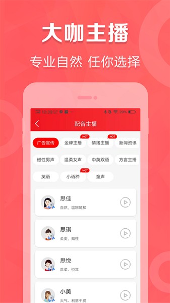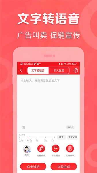 叫卖广告录音app为大家带来了非常智能的文字转语音工具,拥有超多的声音可以进行选择,无论是模拟单人配音还是多人配音都行的,能够根据自己的需求添加喜欢的背景音乐,还可以进行纯净的录音了,之后导出文件到本地自由使用。