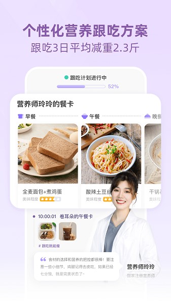 作为一个私人营养师服务平台,这里集合了无数在专业营养师指导下,靠好好吃饭成功实现「身材管理」的案例,包括明星以及若干达人。跟吃计划旨在为你匹配与你生活习惯、健康情况、体型高度相似的案例,跟着ta吃,享受轻盈。你可以在这里查看明星同款餐卡,每餐打卡还能收获营养师专业餐卡点评,带你养吃好好吃饭的习惯,方法科学,效果明显。