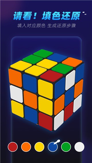 对魔方进行填色,智能识别状态,AI算法将给出详细还原步骤,帮你逐步还原魔方,对照步骤,轻松跟学,零基础魔方小白也能快速还原魔方。