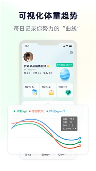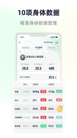 3、采用个性化减脂方式,搭配智能体脂秤,可快速检测身体数据,全面了解用户身体健康状况。