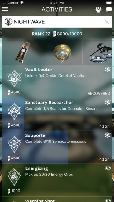 检查您当前在 Nightwave 系列中的等级,以及每日和每周任务的完成情况! 另外,先睹为快看看下一级别的奖励是什么。