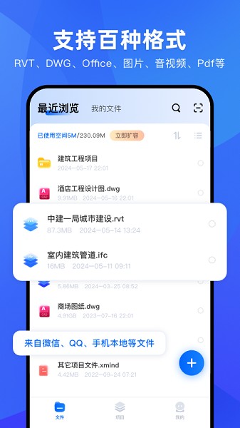 BIM快看支持多种BIM模型、CAD图纸及各类工程文件的手机在线查看,通过BIM快看,可以直接打开和查看微信、钉钉、企业微信中所接收到的图纸,也可以直接打开和查看存放在手机或电脑本地的不同版本的模型图纸及各类工程文件。