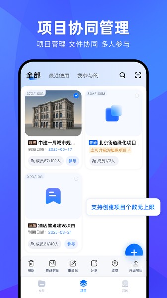 支持创建多个项目,支持项目扩充空间、增加人员,支持添加项目成员、上传文件留痕、控制成员使用权限等。