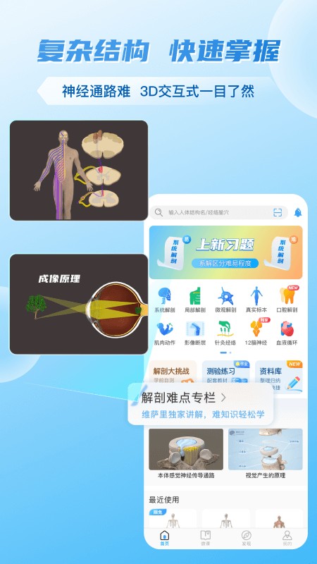 2、学习模式:上解剖课,帮助你练习课堂上学到的知识,不断巩固,加深印象。