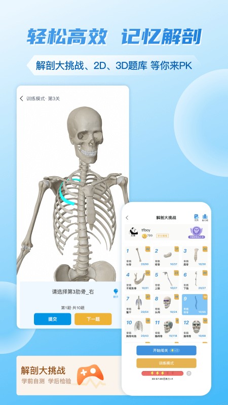 5、练习模式:解剖闯关挑战,3D测验,边学边练,巩固学习效果。