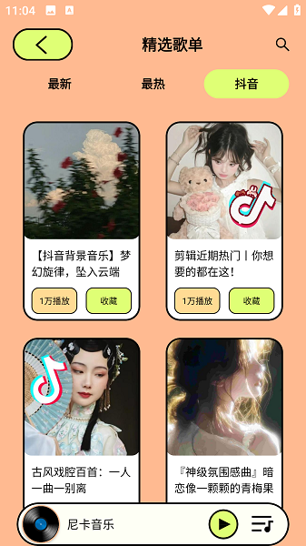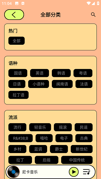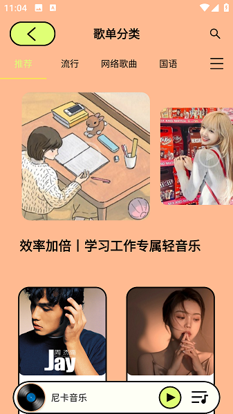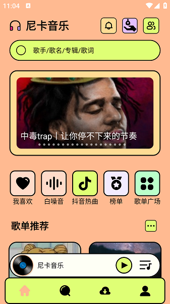 尼卡音乐app可以让大家免费播放全网超多的音乐资源,为各种音乐进行了详细的分类,想怎么筛选各种歌单都行的,还可以直接搜索点播心仪的音乐了,无论是中文歌还是外语歌这里都有收录,每次还可以下载对应音乐到本地。