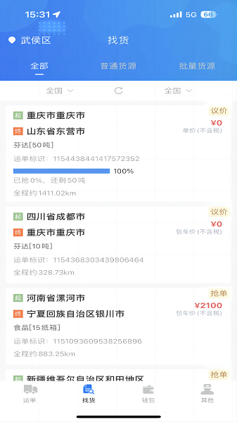 在找货页面中按照运输路线以及货源类型等相关信息查找货源。