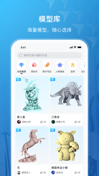 同时,我们鼓励有原创设计能力的用户入驻平台,让模型库成为展示创意的绝佳平台。