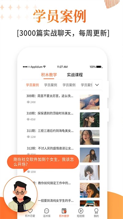 2、实战案例教学:在积木教学中心设有实战课程栏目,提供了3000篇实战聊天案例资源,用户可以通过学习这些案例,快速掌握聊天技巧,提升实战能力。