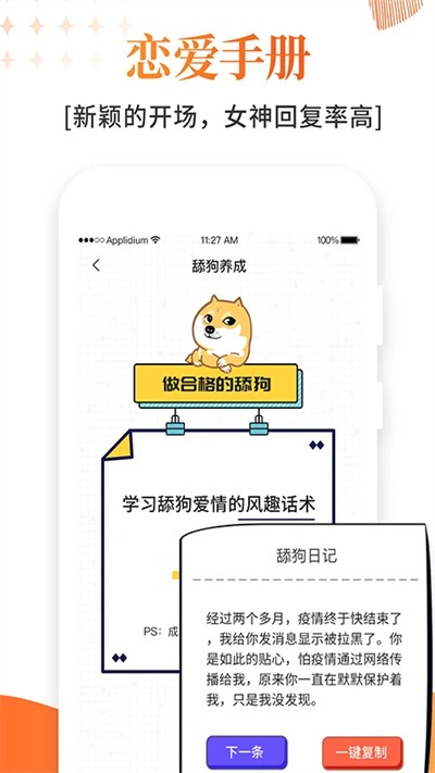 1、一款实时解决尴尬聊天情况的恋爱聊天工具。 聊天技巧、聊天技巧都提供给你。 一款可以与伴侣甜蜜交谈的聊天应用。 一键搜索教你如何聊天回复,如何俘获你的心。