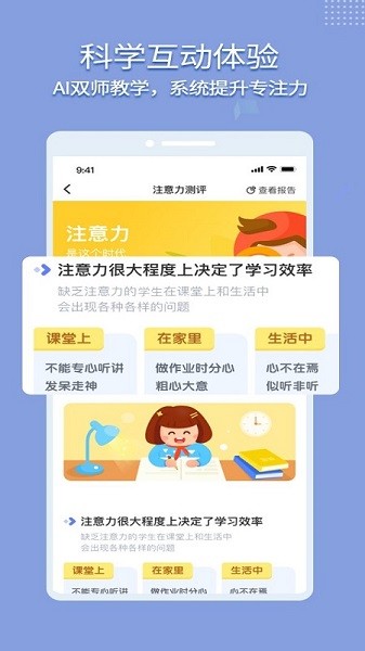 孚科思专注力app专门为少儿打造的专注力训练平台,带进来的课程都可以轻松的进行学习,能够有效提升专注的能力,日常训练起来都非常的便捷,从多个方面来进行练习了。带来的家长课堂可以自由查看,让家长注重亲自教育。