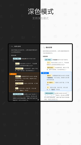 文本折叠:针对不同的标题段落,点击“H1”“H2”“H3”段落符号即可折叠当前段落。方便地进行大纲式的阅读及管理。