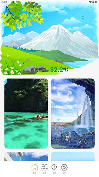 用户下载并打开软件后,会进入首页,首页会显示用户手机的电池温度,并有多种充电壁纸可供选择。
